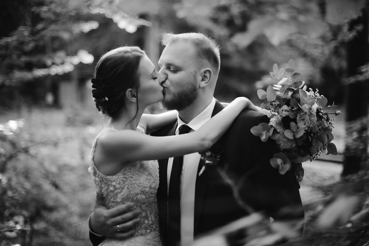 Sesję ślubną podczas trwania wesela wykonaliśmy na terenie Złotego Jaru oraz w pobliskim lesie. Zdjęcia rozpoczęliśmy przed głównym budynkiem, by uwiecznić fasadę gospodarstwa w tle. Następnie przeszliśmy kawałek dalej, pod drewnianą chatkę w której organizowane są śluby w plenerze. Para młoda szybko się rozluźniła, skupiała na sobie całą uwagę i oddała się emocjom, dzięki czemu mogłam stworzyć romantycznie i naturalne zdjęcia z sesji w dniu ślubu. Sesja ślubna w lesie była pełna naturalnego uroku, a każdy kadr opowiadał swoją historię. Słońce przebijało się przez gałęzie drzew, tworząc magiczne efekty świetlne. Pogoda była przepiękna, a pagórki gęsto porośnięte drzewami stwarzały nam idealne tło do zdjęć. Paprocie i zieleń zawsze wyglądają pięknie na zdjęciach, a znajdujący się w środku lasu drewniany mostek również wykorzystaliśmy podczas naszej sesji.
