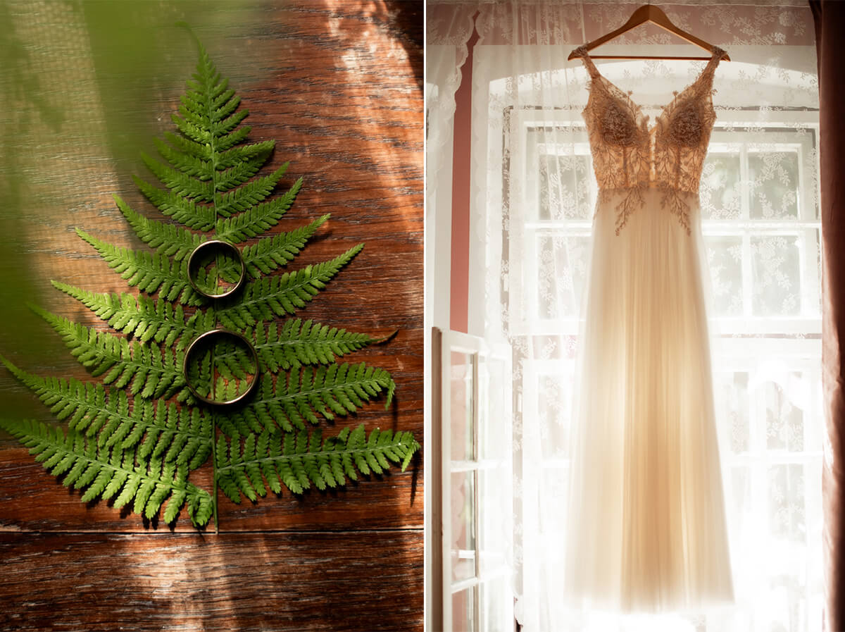 Przygotowania do ślubu Eweliny i Maćka zorganizowaliśmy w pokojach noclegowych Złotego Jaru. Z Eweliną w jej siostrą, która była jej świadkową ulokowałyśmy się w niewielkim pokoiku w którego wnętrzu czułyśmy się jak w innym świecie. Tapety w stylu vintage, stare klimatyczne meble, drewniane lustro i obrazki na ścianach stwarzały wrażenie cofnięcia się w czasie. Przez okno przysłonięte koronkową zasłoną wpadały promienie słońca, tworząc przytulną i magiczną atmosferę. Radość i emocje towarzyszyły dziewczynom na każdym kroku, a ja z aparatem w ręku starałam się uchwycić te ulotne momenty. Zaraz obok, Maciek również przygotowywał się do wielkiego dnia. W kameralnej atmosferze, pełnej śmiechu i emocji, czułam, że to będzie wyjątkowy ślub.