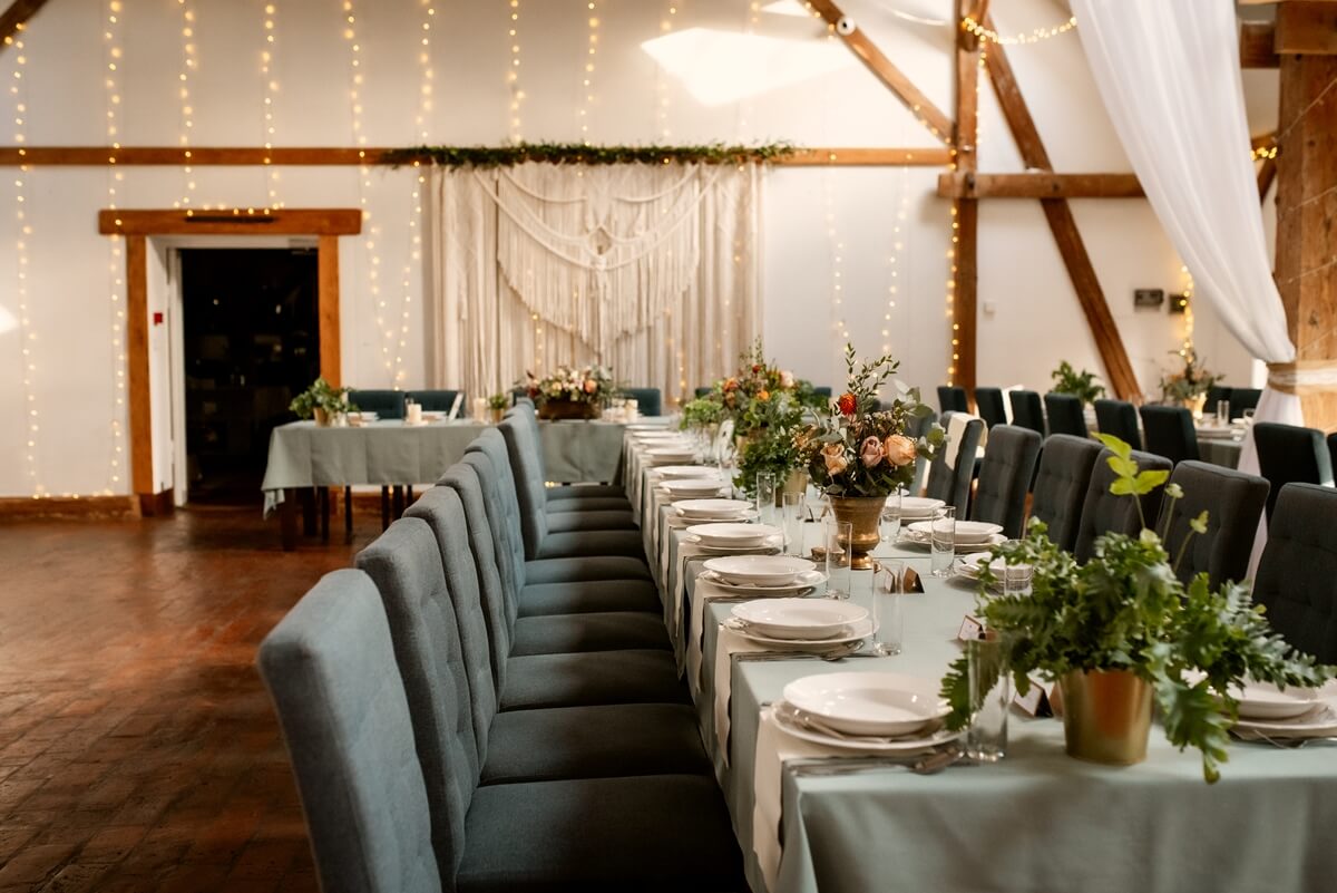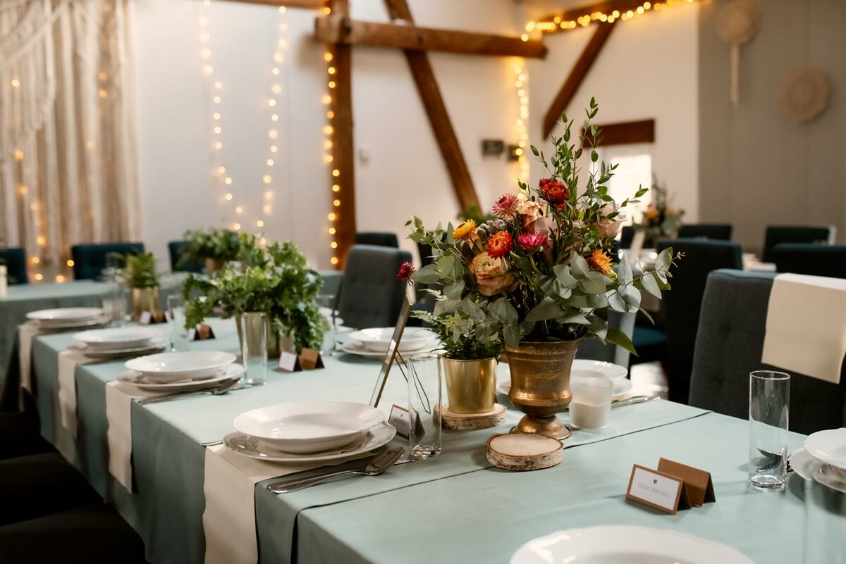 Wracając do samej sali weselnej. Wnętrze oświetlone jest tysiącem lampek w ciepłych barwach, co również świetnie wygląda na zdjęciach z wesela. Stoły udekorowane są najczęściej w rustykalnym stylu. Stoją na nich wazony z dużą ilością kwiatów z kolorystycznym akcentem przewodnim całej uroczystości. Podłoga z zabytkowej cegły i drewniane elementy tworzą klimat sali weselnej w sielskim klimacie.