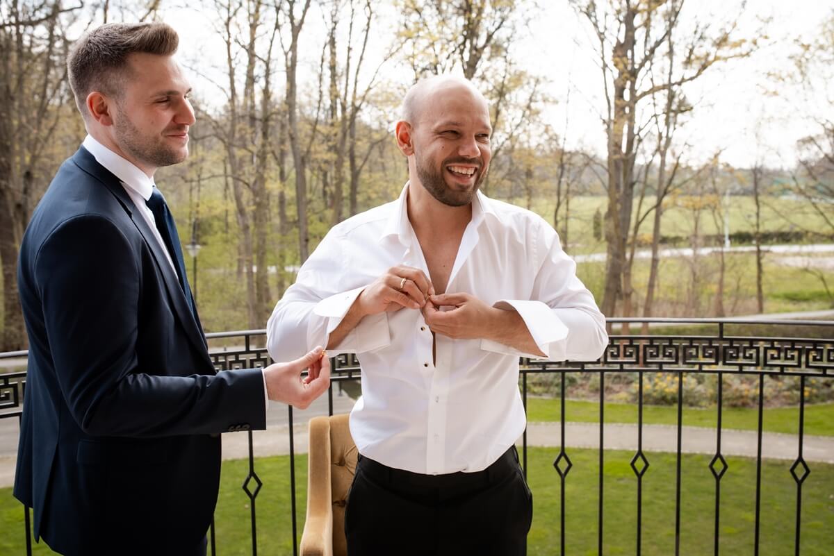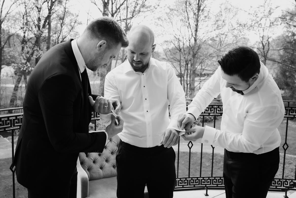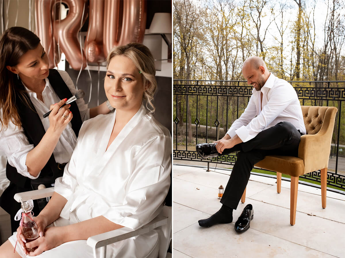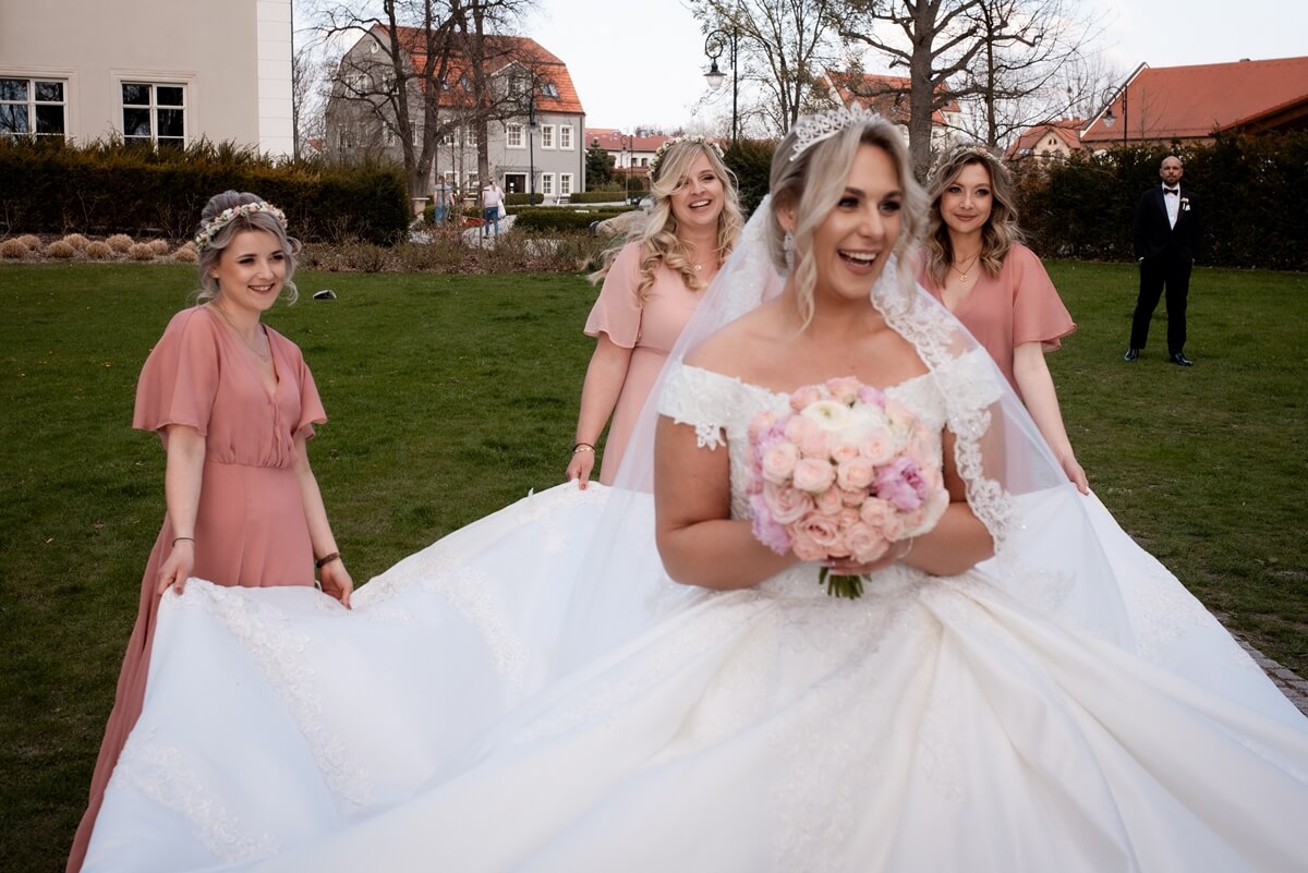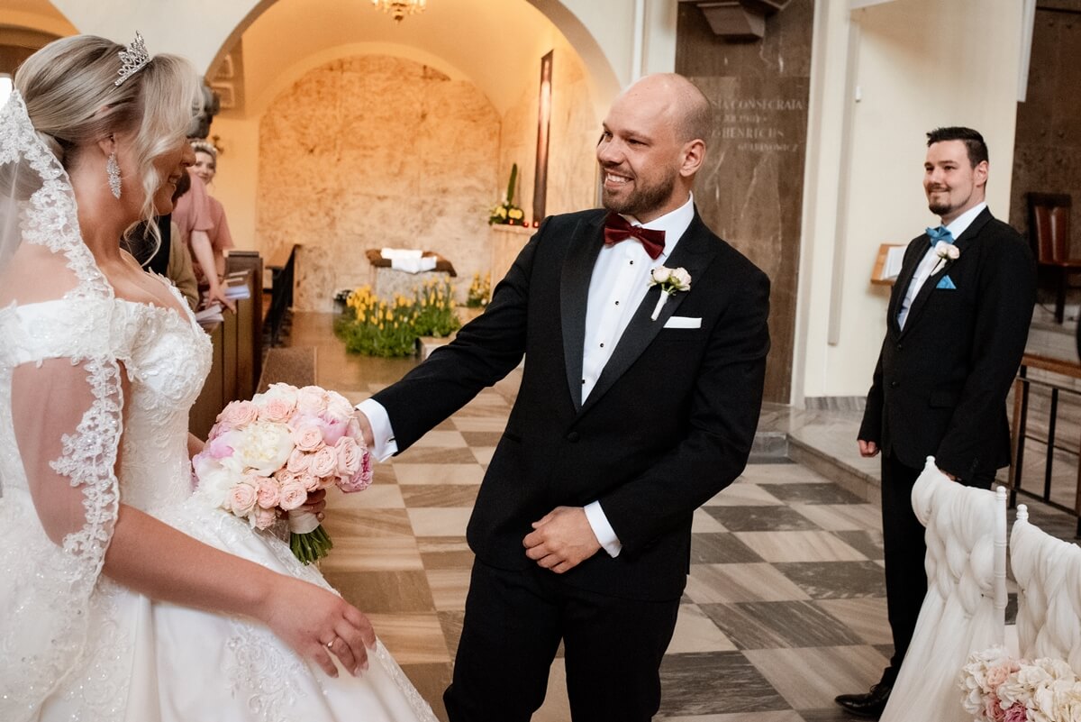 Przygotowania do tego wyjątkowego dnia odbywały się w komfortowych pokojach hotelowych, które oferują luksus i spokój. Pan młody miał swój własny pokój z tarasem – to właśnie tam zorganizowaliśmy jego szykowanie się do ślubu w gronie najbliższych przyjaciół. Ania wraz ze swoimi świadkowymi rozpoczęły od lampki szampana. To idealny moment na uchwycenie ich prawdziwej przyjaźni. Panna Młoda wymarzyła sobie swój ślub w klimacie glamour – wszystko było idealnie przygotowane pod ten właśnie styl. Tego dnia Ania miała na sobie piękną suknię i delikatną koronę – prezentowała się jak prawdziwa księżniczka z zamku!