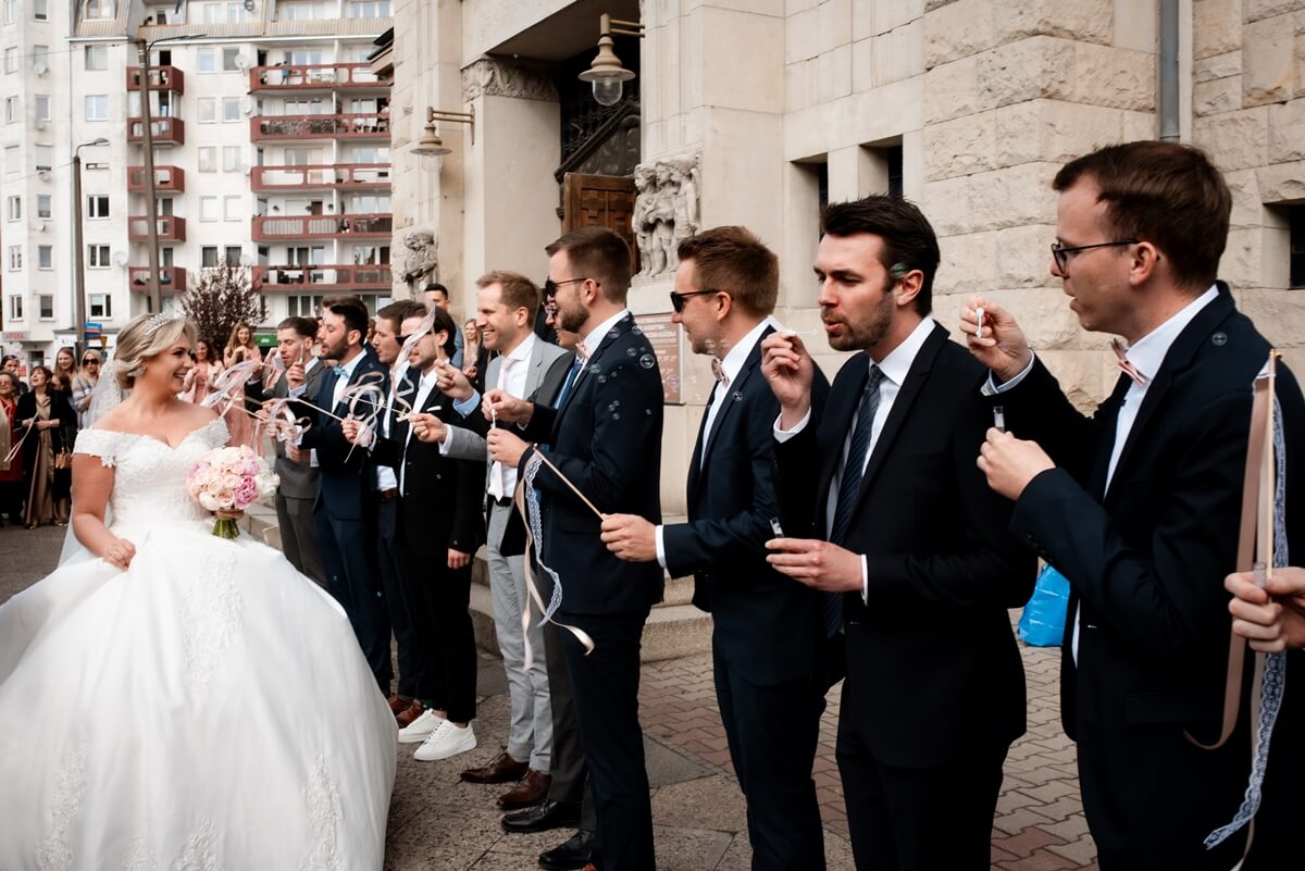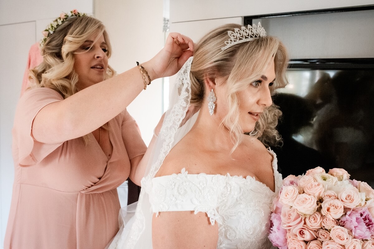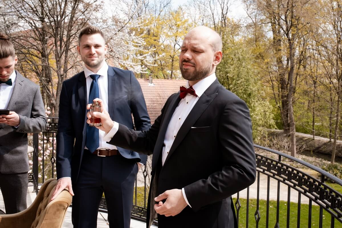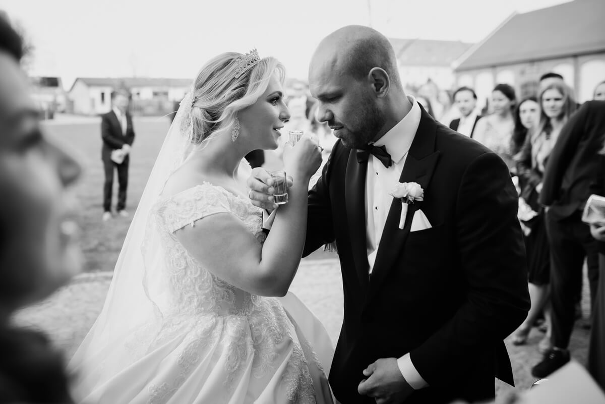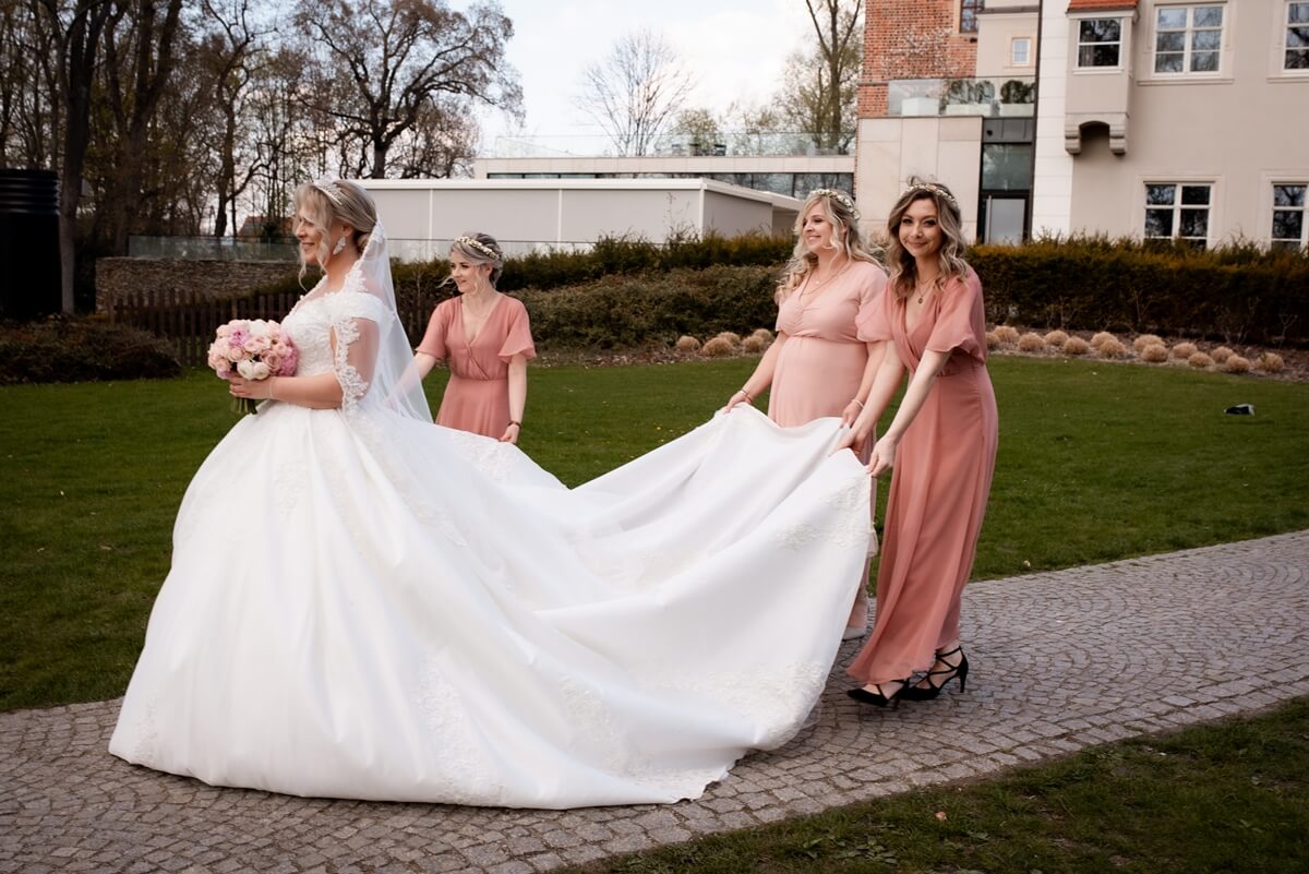 Przygotowania do tego wyjątkowego dnia odbywały się w komfortowych pokojach hotelowych, które oferują luksus i spokój. Pan młody miał swój własny pokój z tarasem – to właśnie tam zorganizowaliśmy jego szykowanie się do ślubu w gronie najbliższych przyjaciół. Ania wraz ze swoimi świadkowymi rozpoczęły od lampki szampana. To idealny moment na uchwycenie ich prawdziwej przyjaźni. Panna Młoda wymarzyła sobie swój ślub w klimacie glamour – wszystko było idealnie przygotowane pod ten właśnie styl. Tego dnia Ania miała na sobie piękną suknię i delikatną koronę – prezentowała się jak prawdziwa księżniczka z zamku!