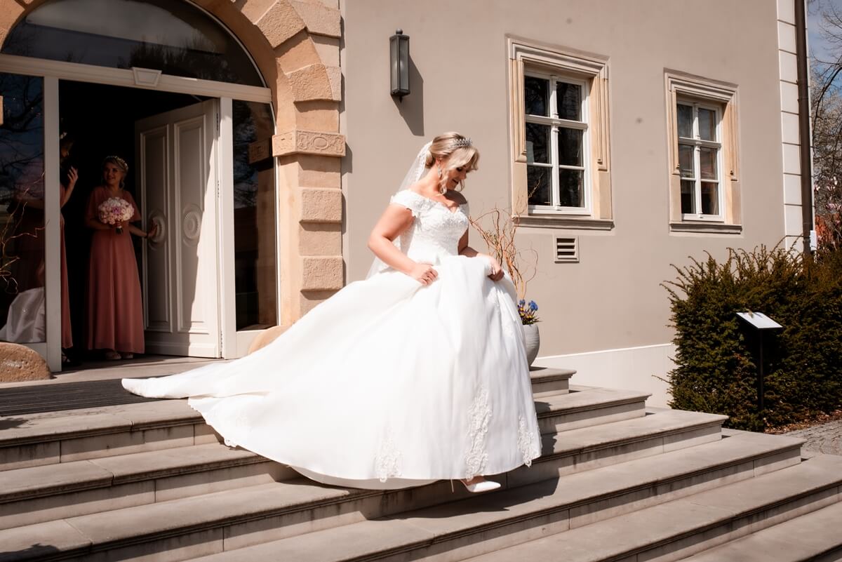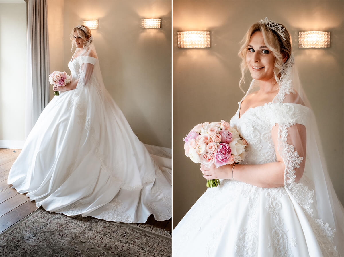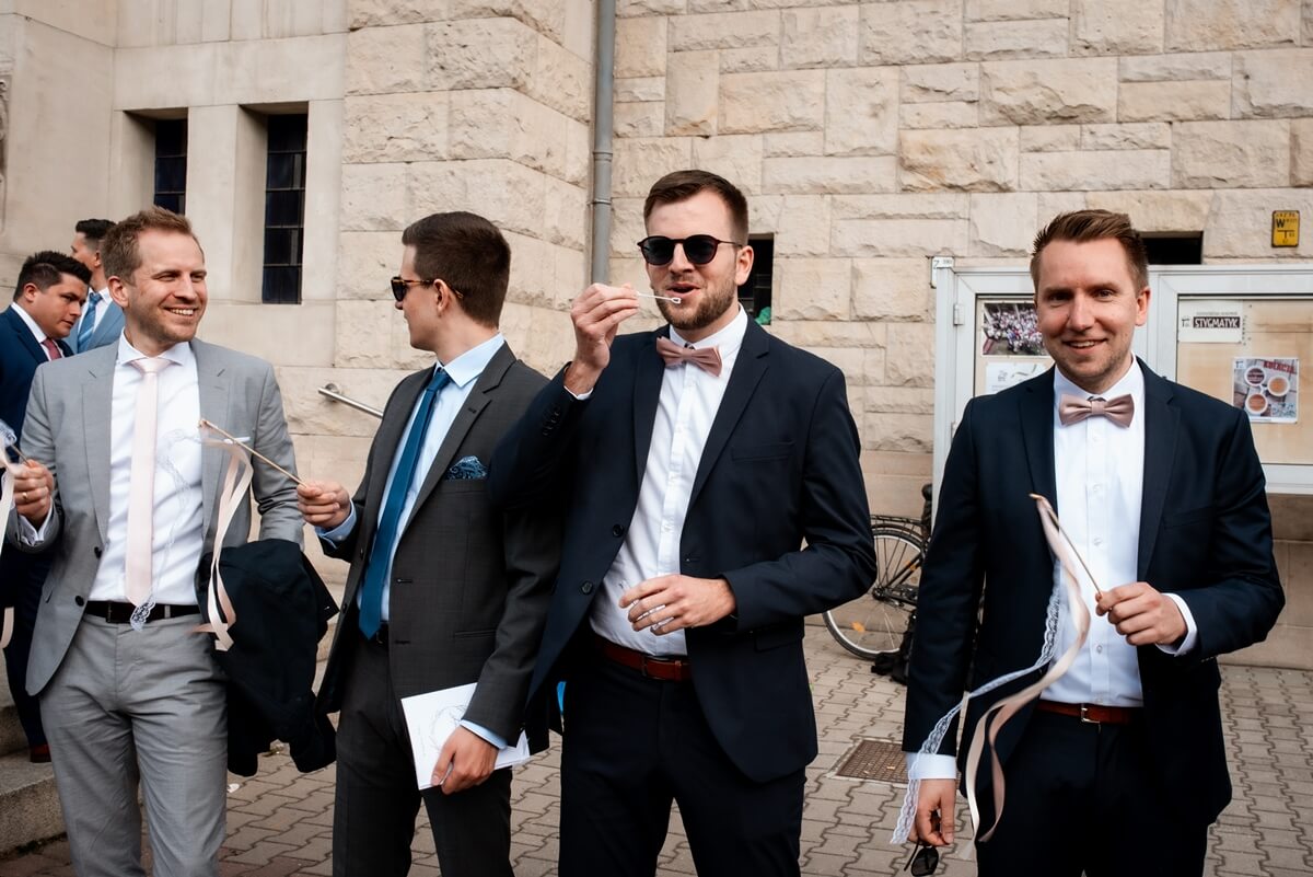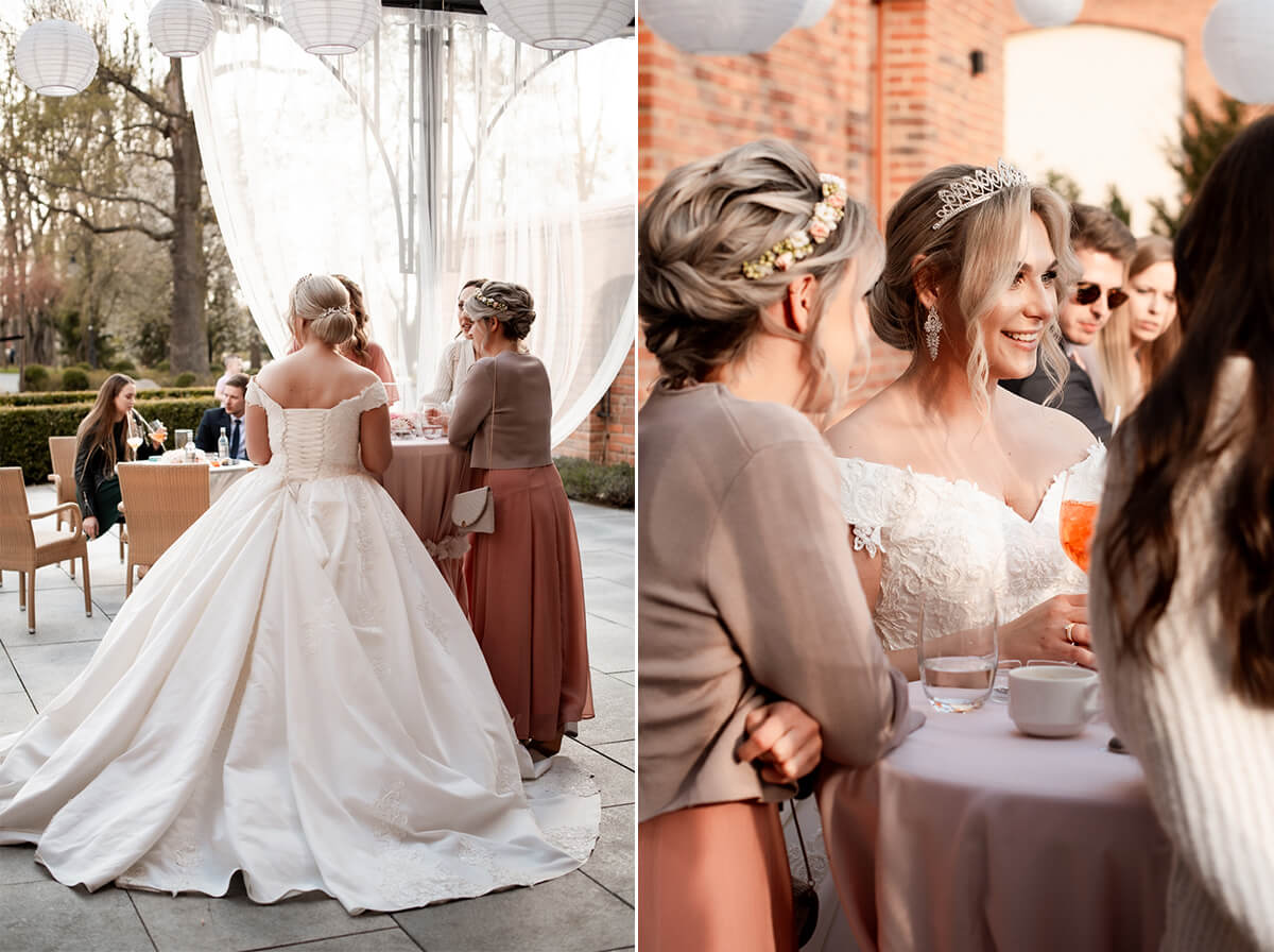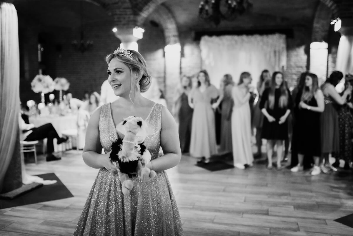 Przygotowania do tego wyjątkowego dnia odbywały się w komfortowych pokojach hotelowych, które oferują luksus i spokój. Pan młody miał swój własny pokój z tarasem – to właśnie tam zorganizowaliśmy jego szykowanie się do ślubu w gronie najbliższych przyjaciół. Ania wraz ze swoimi świadkowymi rozpoczęły od lampki szampana. To idealny moment na uchwycenie ich prawdziwej przyjaźni. Panna Młoda wymarzyła sobie swój ślub w klimacie glamour – wszystko było idealnie przygotowane pod ten właśnie styl. Tego dnia Ania miała na sobie piękną suknię i delikatną koronę – prezentowała się jak prawdziwa księżniczka z zamku!