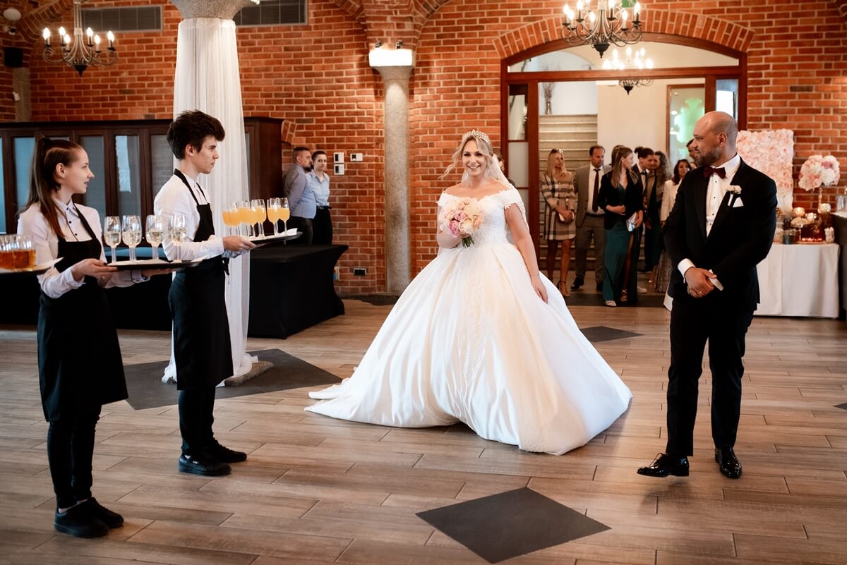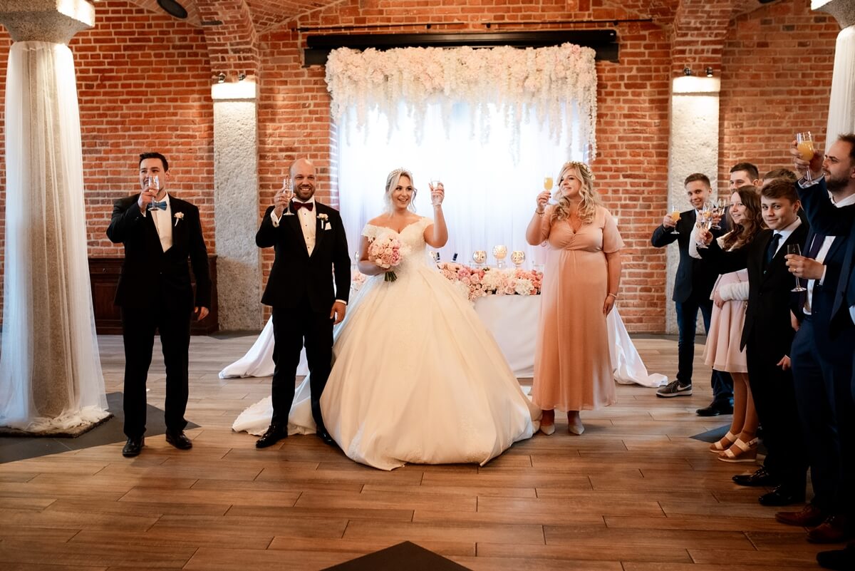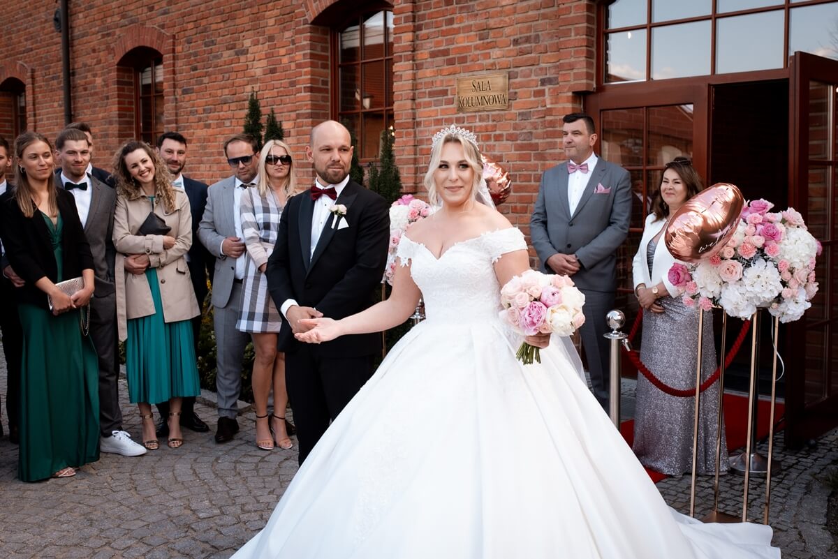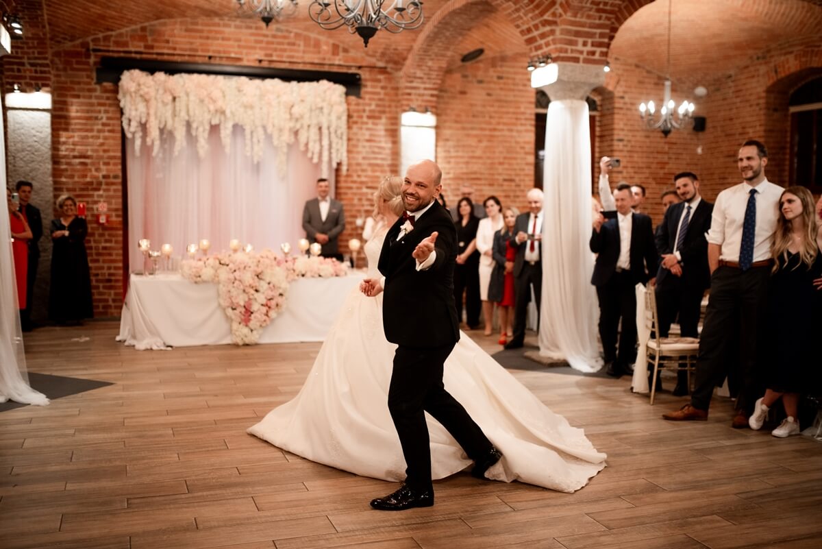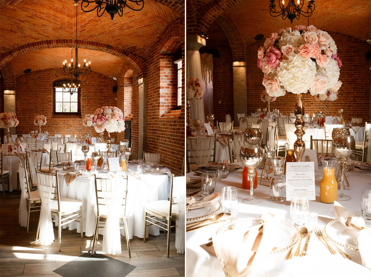 Wesele – to był naprawdę wyjątkowy punkt tego dnia! Ania i Simon zdecydowali się na Salę Kolumnową, która wyglądała jak balowa sala z bajki! To eleganckie wnętrze z ceglaną ścianą, kolebkowymi stropami i stylowym oświetleniem tworzy niesamowitą atmosferę. Granito­we kolumny dodają mu jeszcze więcej klasy i majestatu.
