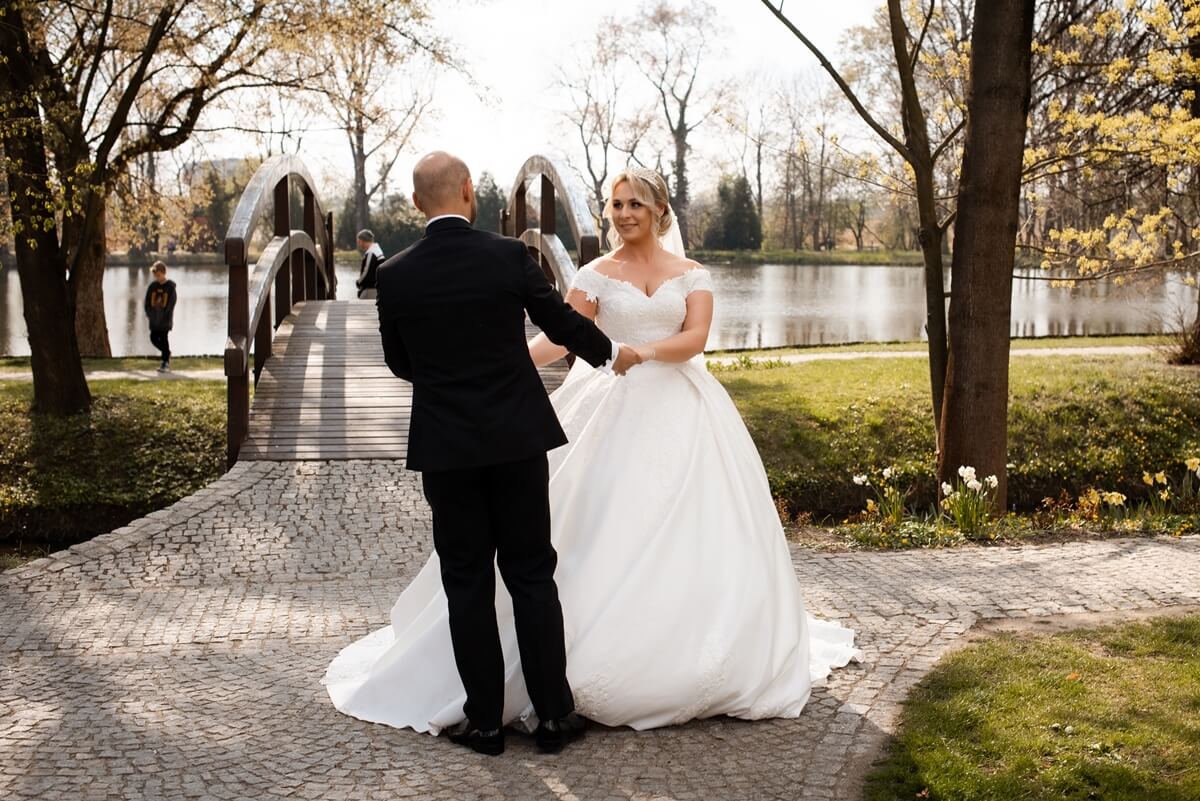 Widok z okien? Cóż, można się w nich rozmarzyć! Widać dziedziniec zamku, piękny Park Historyczny i staw, które dodają magii całej atmosferze. Co więcej, sala ma możliwość pełnego zaciemnienia, więc w trakcie wieczoru można stworzyć intymny, romantyczny klimat, a prywatny taras to świetne miejsce na chwilę oddechu czy sesję plenerową. Przy okazji, podczas sesji zdjęciowej, złapałam te magiczne momenty – uśmiechy, spojrzenia pełne miłości i radości, a wszystko to w otoczeniu tych eleganckich, historycznych wnętrz. To miejsce naprawdę sprzyja tworzeniu niezapomnianych wspomnień – zobaczcie sami!